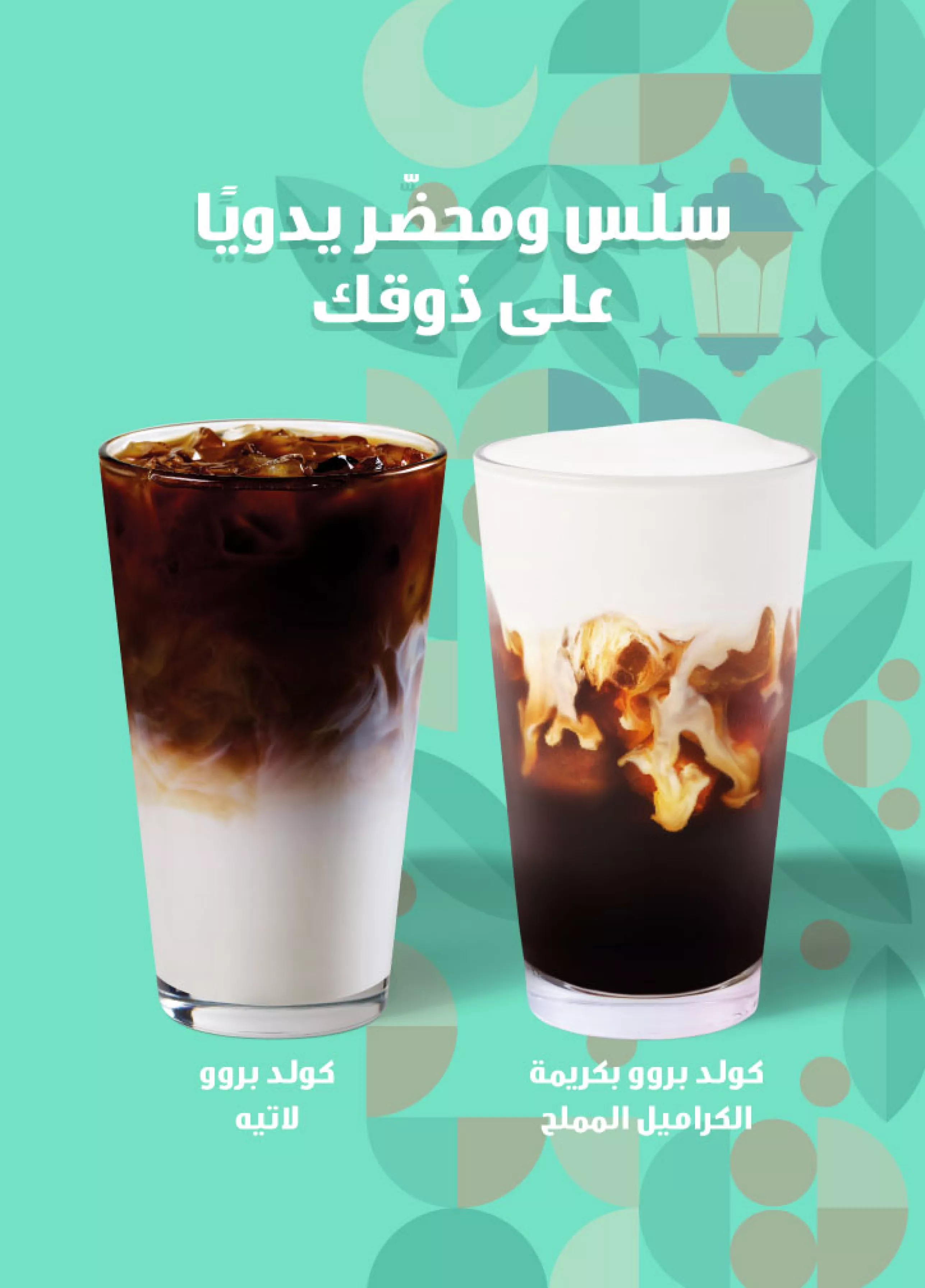 فهل سبق لك أن جربت قهوة ستاربكس كولد بروو بكريمة الكاراميل؟ إنها مزيج مثالي من المكونات الحلوة للكاراميل المملح وصلصة الموكا البيضاء والقهوة المثلجة المنعشة. وإذا كنت تفضل شيئاً أكثر كلاسيكية، فعليك بقهوة كولد بروو لاتيه.