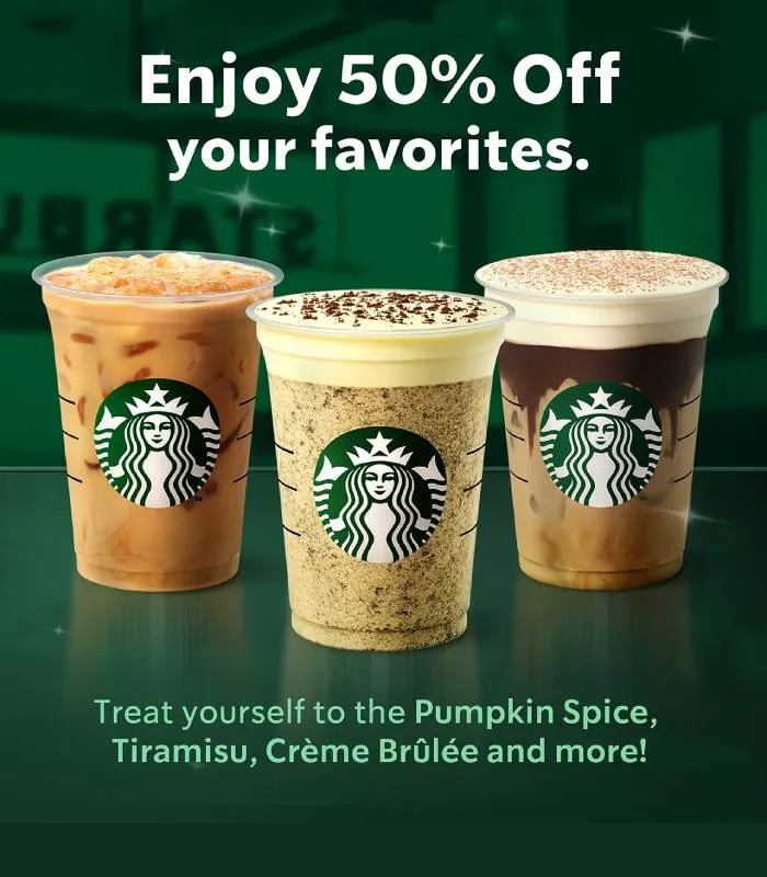 • Offer is only applicable on Frozen Berry Hibiscus Starbucks Refresha, Frozen Mango Dragonfruit Starbucks Refresha, Frozen Strawberry Acai Starbucks Refresha, Tiramisu Latte, Tiramisu Iced Americano, Tiramisu Iced Latte, Tiramisu Frappuccino, Crème Brulée Brown Sugar Frappuccino®, Crème Brulée Cold Brew, Crème Brulée Iced Americano, Peach Apple Cream Iced Tea, Pumpkin Spice Latte, Iced Pumpkin Spice Latte, Pumpkin Spice Coffee Frappuccino, Pumpkin Spice Crème Frappuccino, Iced Tiramisu Matcha Latte, Iced Pumpkin Spice Matcha Latte